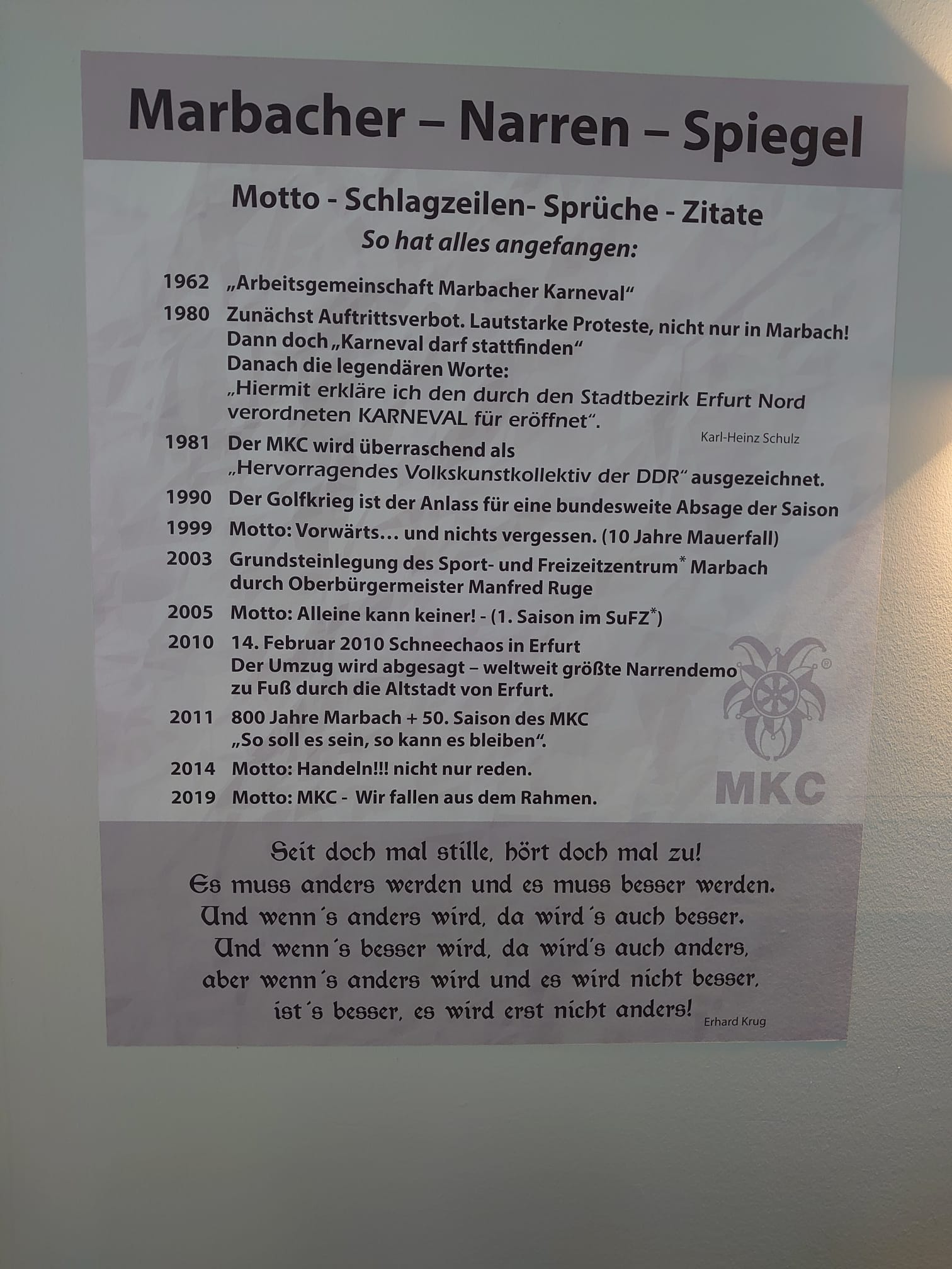 Zur Wahrheit gehört aber auch, dass wir uns - mit großem Bedauern gegenüber unserem treuen Publikum - dagegen entschieden haben, in dieser Saison öffentliche Veranstaltungen so durchführen zu wollen, wie Sie dies von uns seit Jahren gewohnt seid. Wir bitten daher um Verständnis, dass wir uns ausgerechnet in der Jubiläumssaison Nr. 60 nicht in der MKC-Narrhalla sehen werden, nicht mit Ihnen gemeinsam Karneval feiern können. Die Risiken, die mit der Durchführung einer solchen Veranstaltung verbunden sind, sind uns einfach zu groß: Angefangen von den ungünstigen wirtschaftlichen Rahmenbedingungen über die Bedenken, welche Auswirkungen das Auftreten möglicher Infektionen ausgerechnet bei einer MKC-Veranstaltung haben könnte, bis hin zu der überaus realistischen Möglichkeit, dass bei steigenden Infektionszahlen ggf. die mit viel Aufwand hergerichtete Narrhalla schlussendlich gem. behördlicher Anordungen gar nicht geöffnet werden kann.