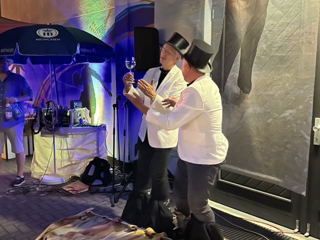 Gut gestärkt konnten die Gäste dann das Abendprogramm verfolgen. Werner Mattausch und Uli Berg mit gesprochenem Wort und Kurzauftritten der Stammtischbrüder sowie Tourettes bereicherten den Abend. Die Zeit dazwischen und danach gehörte DJ Iffect, dem Mann, der ein Publikum lesen kann wie kein zweiter. Als Überraschung gab es auch noch eine Darbietung von Al Bano und Romina Limberger sowie der Neuminister Flori und Ali - ich sag nur: Ja, ja, der Chianti-Wein!