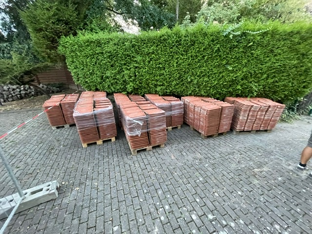 Resultat nach kaum 4 Stunden Arbeit: rd. 1.600 Dachziegel erfolgreich rückgebaut und auch schon die ersten Dachlatten zur Wiederverwendung demontiert.